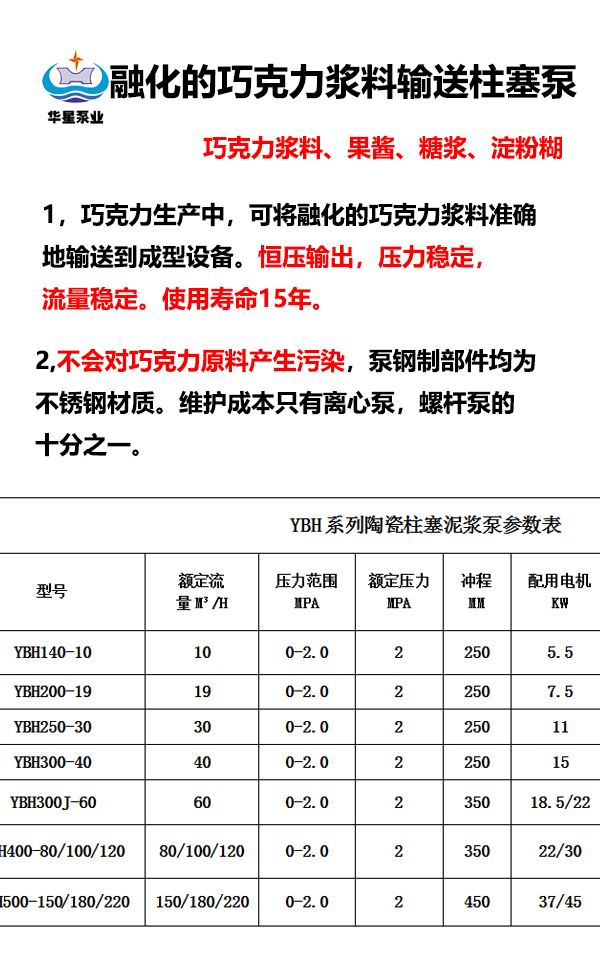 應對高粘度漿料:巧克力漿料通常具有較高的粘度,對輸送設備的要求較高。陶瓷柱塞泵能夠適應高粘度的巧克力漿料的輸送,通過其強大的動力系統和合理的泵體結構,確保巧克力漿料在管道中順暢地流動,不會出現堵塞或流動不暢的情況。